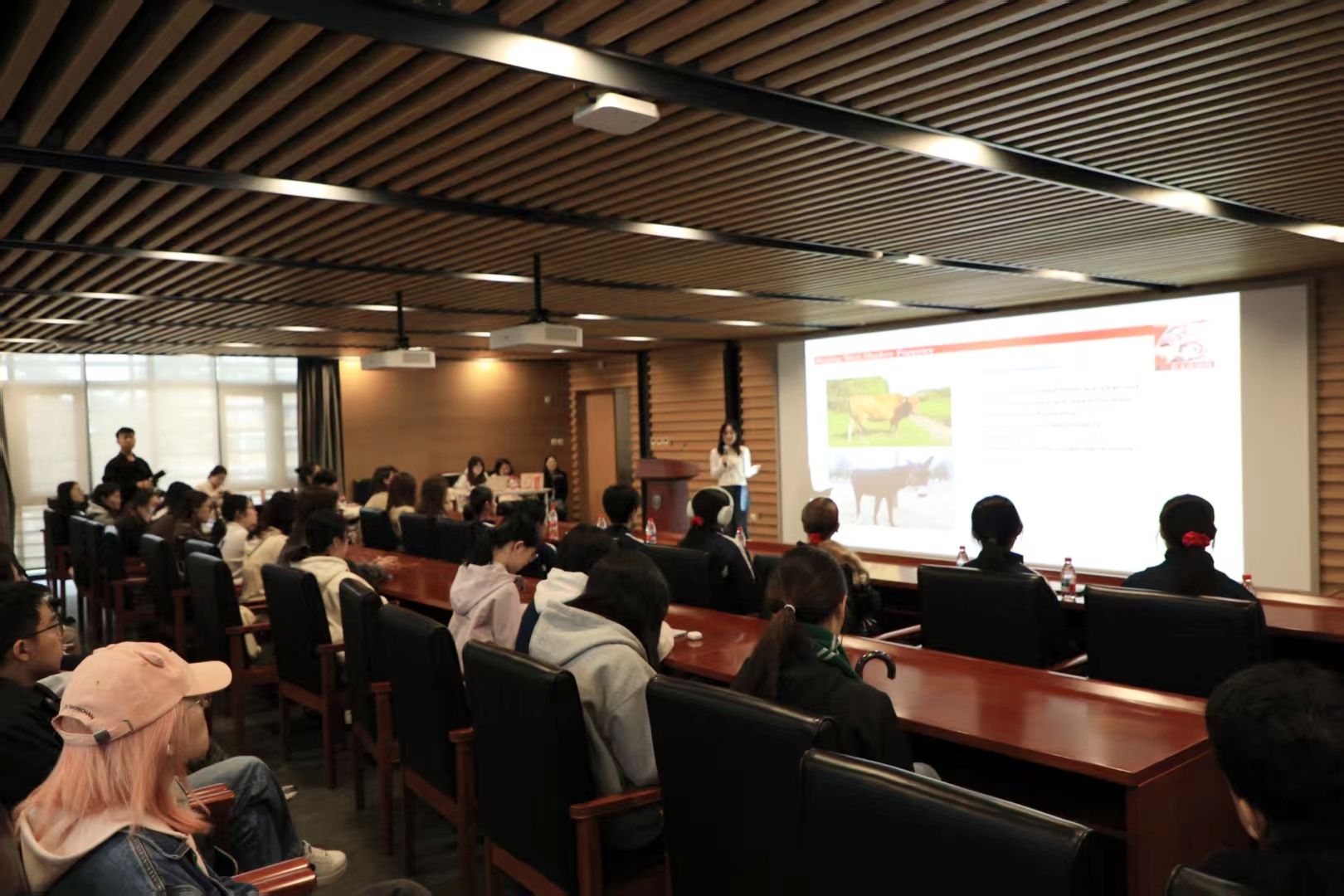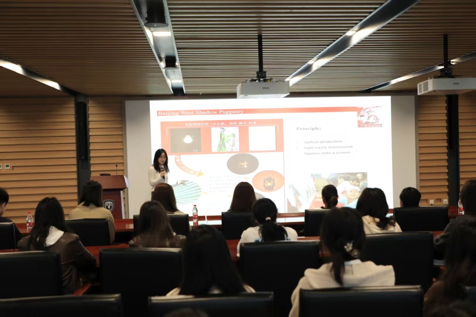 学生屈慧茹以流利的英文向远道而来的美国师生表示欢迎,并阐述了皮影戏作为中国非物质文化遗产的深厚底蕴。随后,韩子萌同学以英文深入讲解了皮影的历史脉络与制作工艺,从皮料选择、雕刻技法到染色定型,清晰展现了皮影从原材料到艺术精品的转化过程,展现了北外学子扎实的语言功底与文化传播能力。