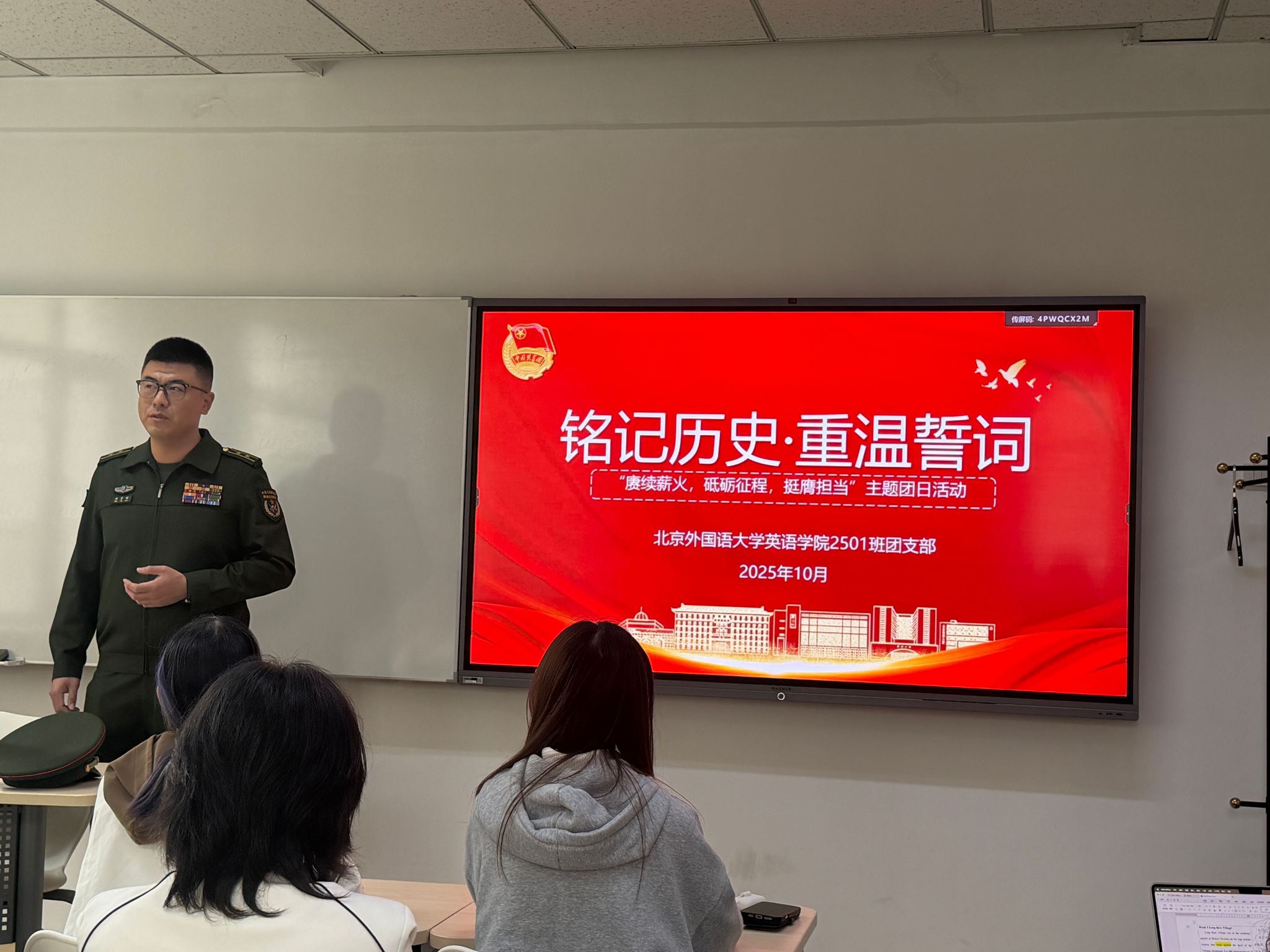本科生团总支于近日开展了“铭记历史・重温誓词”系列主题团日活动,旨在进一步夯实团员青年“听党话、跟党走”的思想根基,厚植爱党爱国爱校情怀,以实际行动传承红色基因,彰显北外青年的使命担当。