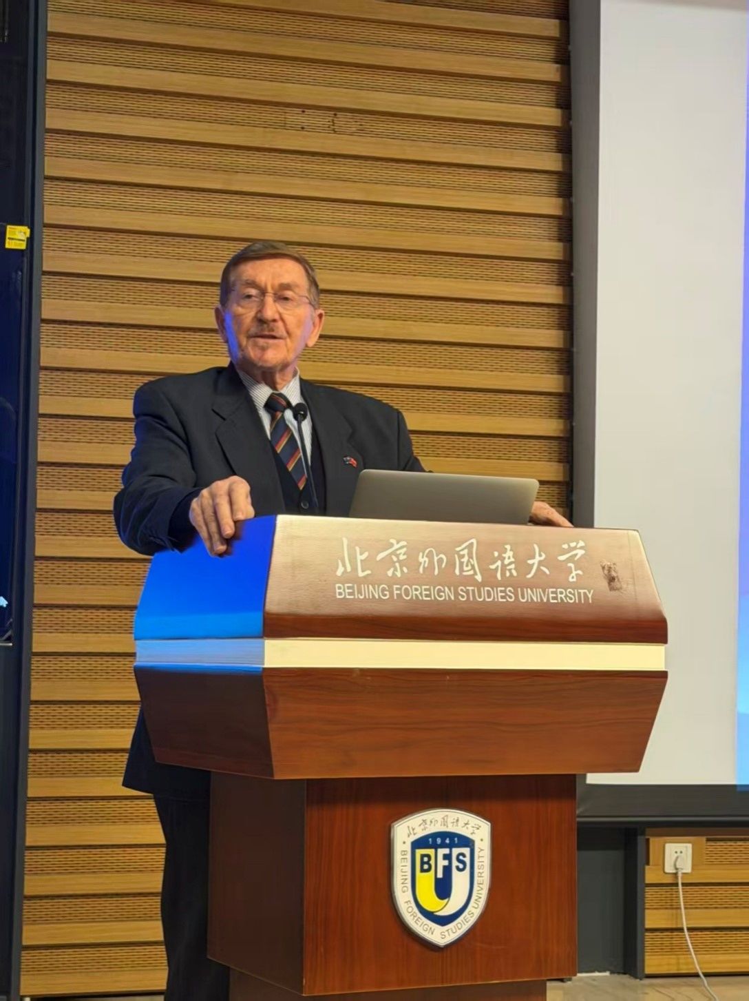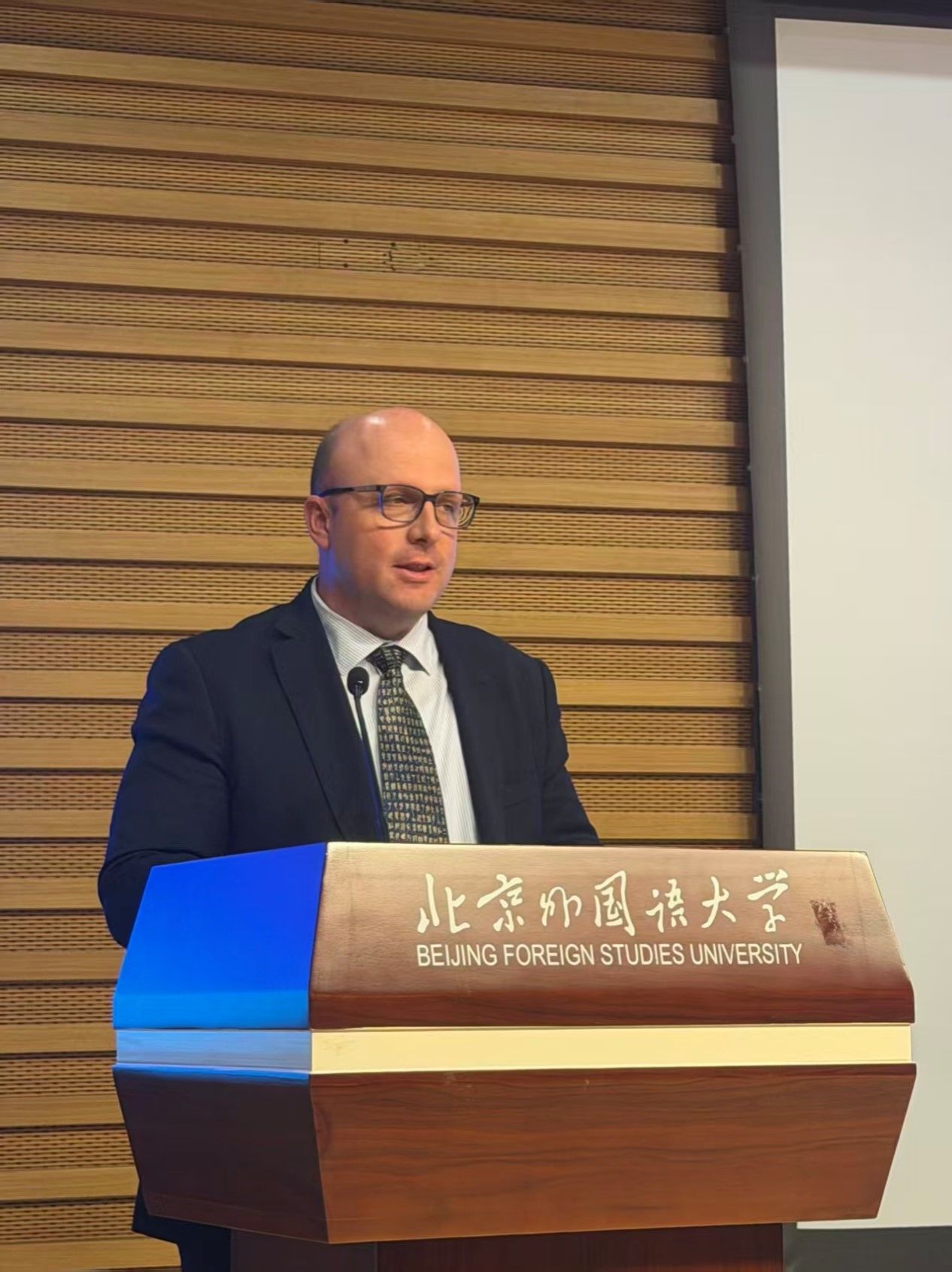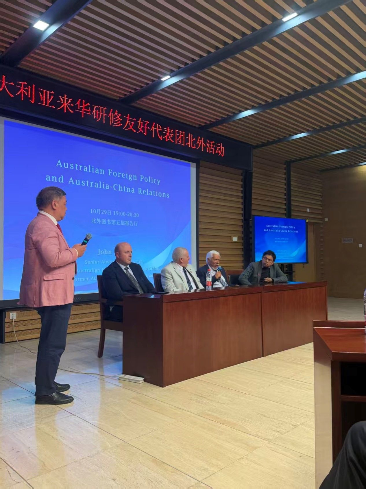 10月29日,澳大利亚来华研修友好代表团北外活动在北京外国语大学图书馆5层学术报告厅举行。代表团团长、首任澳大利亚驻华副大使约翰·兰德(John Lander),代表团副团长、澳大利亚公民党主席罗伯特·巴威克(Robert Barwick),代表团联络人、澳中企业家俱乐部主席袁祖文太平绅士等12位代表团成员,以及北外师生代表出席活动,在热烈友好的氛围中探讨中澳关系、进行跨文化交流。