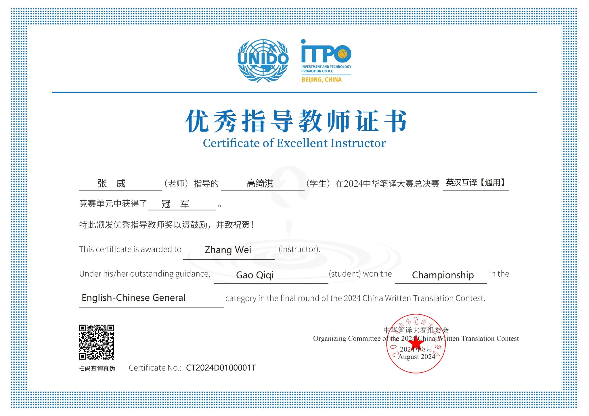 2023级英语口译专业研究生高绮淇在张威教授指导下积极准备,比赛中发挥出色,在激烈竞争中脱颖而出,最终荣获中华笔译大赛总决赛英汉互译“通用”组冠军,张威教授获得优秀指导教师奖。