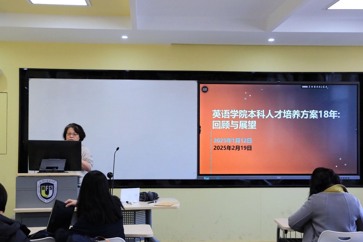 本科人才培养方案18年:回顾与展望”为题作了主旨发言。回顾过去,以2007、2012、2016及2021版本科培养方案为例,系统总结了本科培养方案的逐渐变革与优化。审视当下,英语专业应体现其专业价值和内涵,讲好中国故事,服务好国家发展战略。展望未来,强调新的培养方案仍应坚持立德树人、秉持外特精通的特点,应结合多方意见、建议与反思,对目前仍存在的问题进行改进和完善。