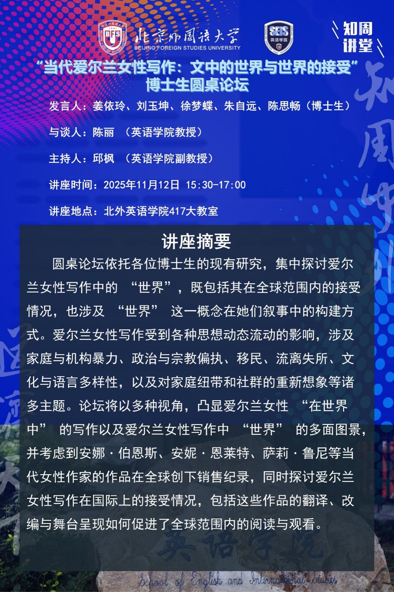 11月12日圆桌论坛:当代爱尔兰女性写作:文中的世界与世界的接受
