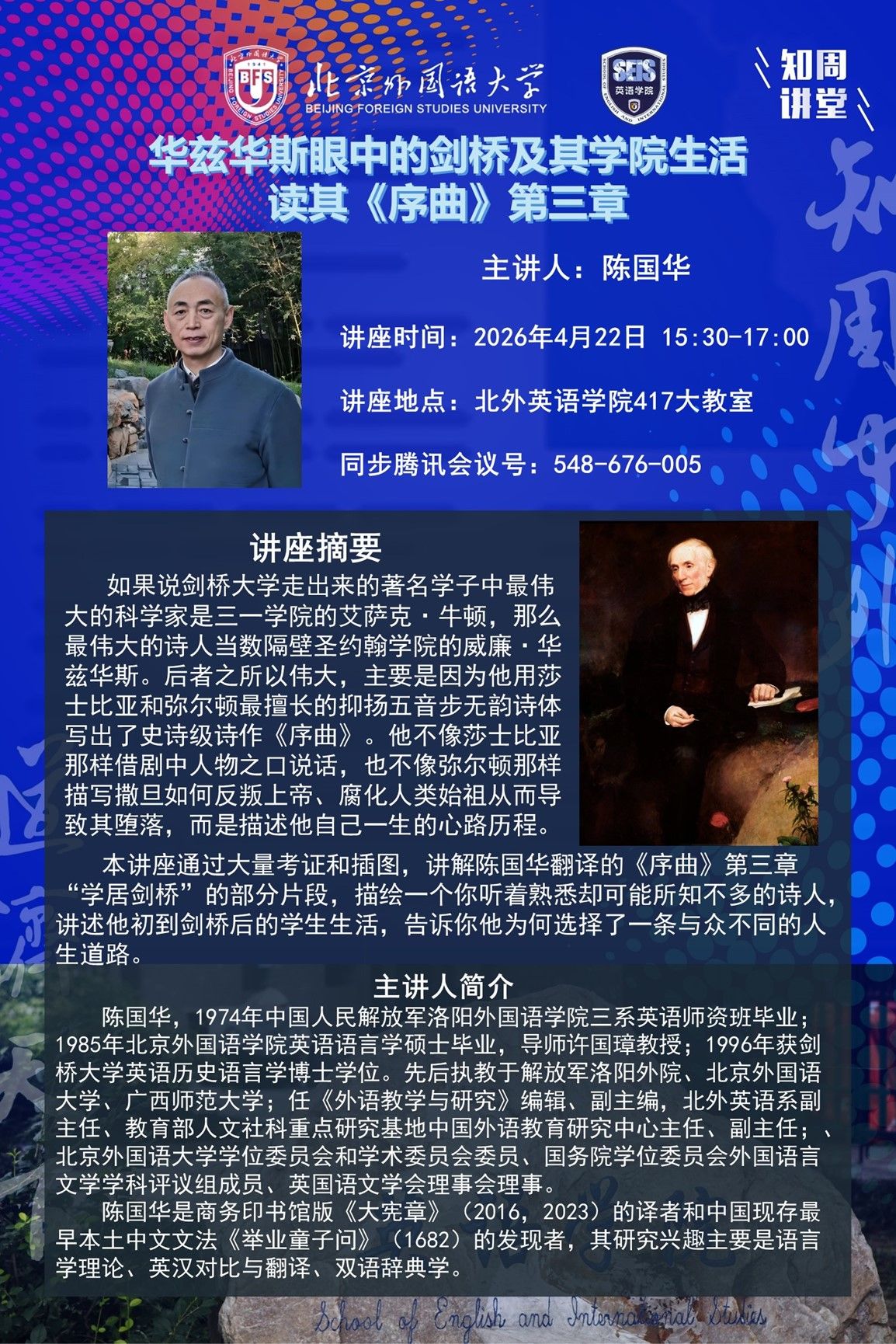 4月22日讲座:华兹华斯眼中的剑桥及其九州娱乐app 生活——读其《序曲》第三章